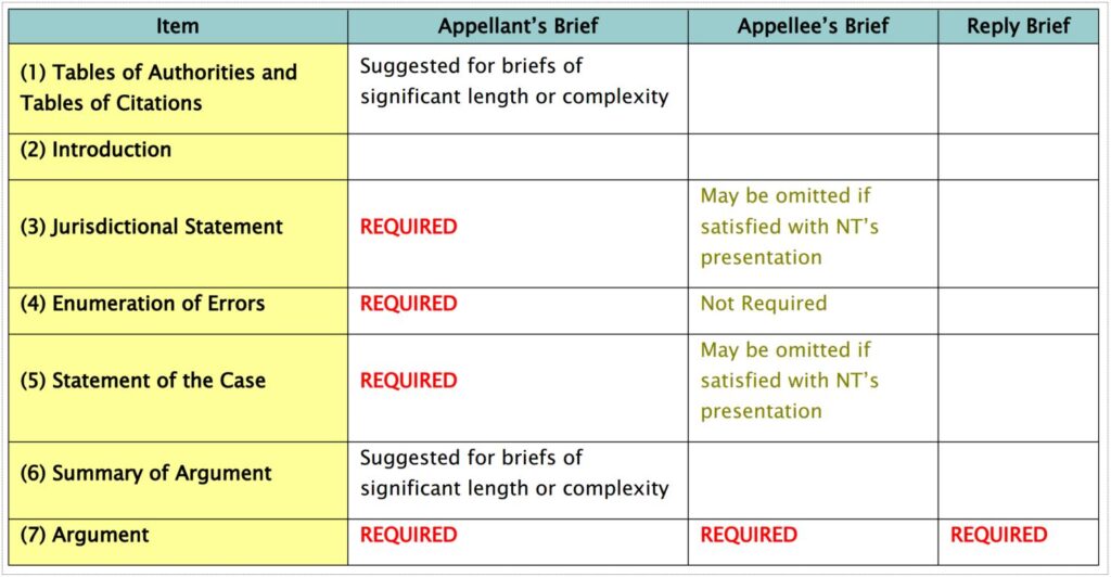 The Court of Appeals of Georgia has amended Rule 25 to prescribe a revised format for the content and structure of briefs. The table below summarizes the new rule, with additional explanations below.