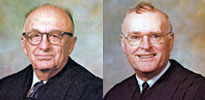 Despite Judge Russell’s candid arguments, the rule of age prevailed. Hill, being 57 years old, became the first Chief Judge. Russell was then 45 but afterwards became Chief Judge and in later years Chief Justice of the Supreme Court. He was the father of the famed United States Senator Richard B. Russell, Jr. His grandson, Robert L. Russell, Jr., was also to serve on the Court of Appeals. This Russell combination is the only one of grandfather-grandson in the Court’s history. As the Russells came from Winder, it is of interest to note that the only father- son combination (Joseph D. Quillian and J. Kelley Quillian) were also from Winder. Of further interest is the fact that Julie and Clay Custer, children of Mr. and Mrs. Henry Custer of Albany, have the distinction of having had both of their grandfathers serve as Judges on the Court of Appeals, viz., Judge Vance Custer and Judge Julian Webb.